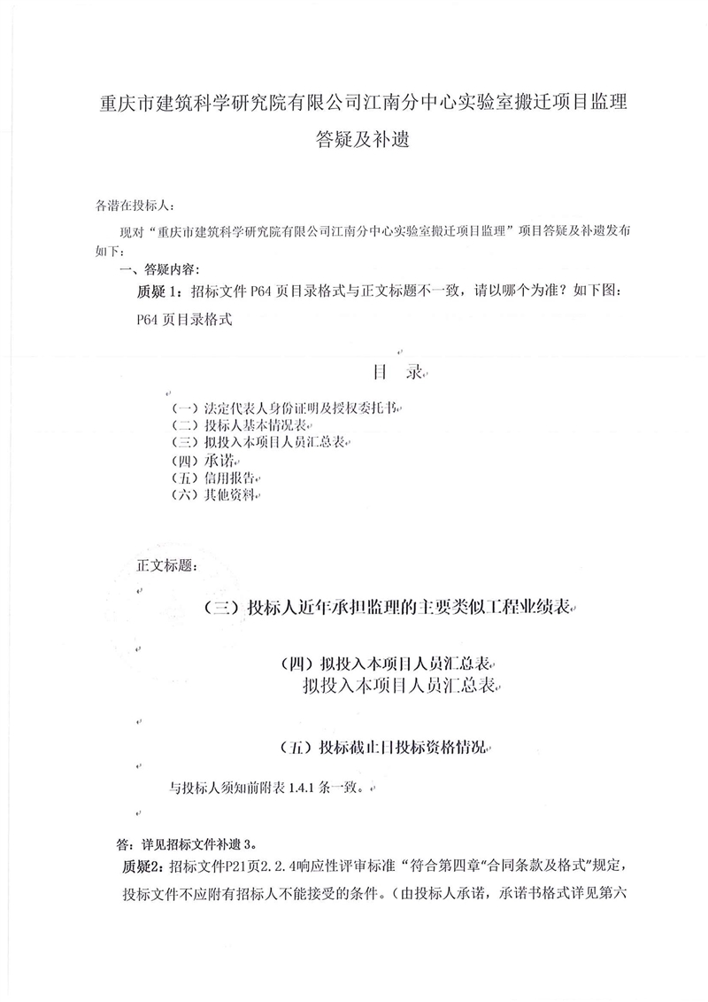 現(xiàn)對“重慶市建筑科學(xué)研究院有限公司江南分中心實驗室搬遷項目監(jiān)理”項目答疑及補(bǔ)遺發(fā)布如下: