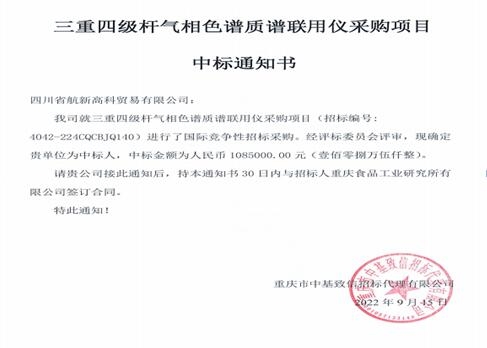 重慶食品工業研究所有限公司委托重慶市中基致信招標代理有限公司對三重四級桿氣相色譜質譜聯用儀采購項目(招標編號:4042-224CQCBJQ140)進行國際競爭性招標采購,現已完成全部采購程序。確定中標人四川省航新高科貿易有限公司,中標金額為人民幣1085000.00元(壹佰零捌萬伍仟整)。