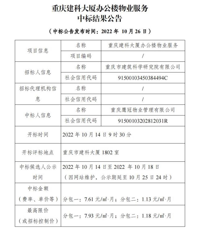 重慶建科大廈辦公樓物業服務中標結果公告