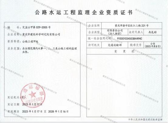 近日,經(jīng)交通運(yùn)輸部核準(zhǔn),重慶設(shè)計(jì)集團(tuán)市建科院公司申請(qǐng)重新核定的公路工程監(jiān)理甲級(jí)資質(zhì)成功獲批并順利取證。