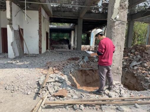 4月初,業(yè)主單位在拆除朝華書院項目裝修結構并開挖基礎時,發(fā)現(xiàn)實際情況與前期鑒定報告中基礎及結構部分不符,施工圖設計單位無法進行后續(xù)設計及指導現(xiàn)場施工,導致項目無法推進,亟需具有權威性及專業(yè)性的單位對房屋結構進行全面檢測,并繪制現(xiàn)場實際結構圖。市建科公司對此類無圖紙或圖紙信息不符的既有房屋檢測鑒定有豐富經(jīng)驗,能夠迅速組織專家組對房屋進行診治,做到對癥施治,切實消除安全隱患。接到委托后,公司專家組立即趕赴現(xiàn)場開展檢測工作,頭頂驕陽汗如雨,不懼“烤”驗趕工,經(jīng)過十余天的艱苦奮戰(zhàn)完成現(xiàn)場檢測工作,轉入數(shù)據(jù)統(tǒng)計及繪制圖紙的室內工作中。
