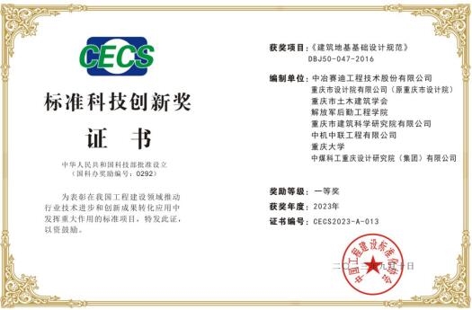 中國工程建設(shè)標準化協(xié)會標準科技創(chuàng)新獎是經(jīng)科技部國家科學(xué)技術(shù)獎勵工作辦公室批準的我國工程建設(shè)標準化領(lǐng)域首個專屬獎項,旨在表彰建筑建材、鐵路交通、水利電力、市政工程、機械電子等我國工程建設(shè)領(lǐng)域推動行業(yè)技術(shù)進步和創(chuàng)新成果轉(zhuǎn)化應(yīng)用中發(fā)揮重大作用的標準項目、單位和個人。市建科院公司副總經(jīng)理、總工程師張京街從事建設(shè)工程質(zhì)量檢測工作39年,兼任重慶市建筑行業(yè)專家?guī)鞂<遥恢鞒?/span>、參與編制標準多項,其中作為主編完成國家標準、行業(yè)標準、地方標準共10項,先后獲得全國建設(shè)工程質(zhì)量檢測行業(yè)先進個人、重慶市杰出人才突出貢獻獎、重慶市學(xué)術(shù)技術(shù)帶頭人等榮譽。此次獲獎的《建筑地基基礎(chǔ)設(shè)計規(guī)范》(DBJ50-047-2016)為我國首部山區(qū)地基基礎(chǔ)設(shè)計規(guī)范,該規(guī)范結(jié)合重慶地區(qū)特點,提出的巖石地基、邊坡地基和嵌巖樁承載力設(shè)計計算,及山區(qū)地基技術(shù)等方面,均為國內(nèi)領(lǐng)先水平。