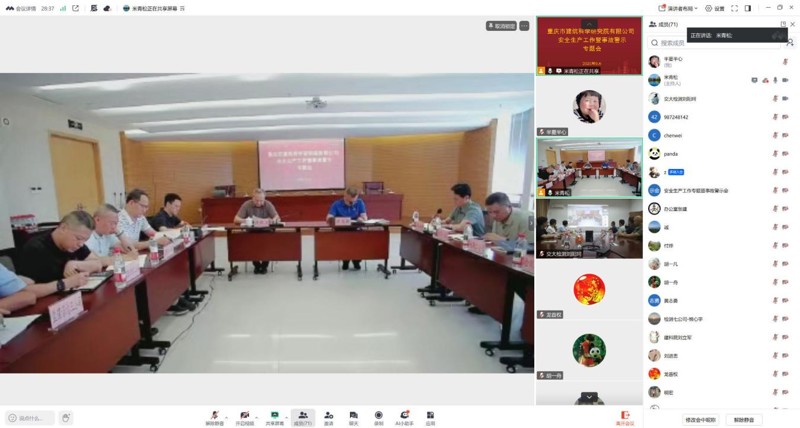 會議組織觀看《福建省泉州市欣佳酒店“3.7”坍塌事故還原解析》《長沙“4.29”特別重大自建房倒塌事故調查報告講解》警示視頻,通報近期行業事故警示案例:川青鐵路尖扎黃河特大橋施工事故情況和成華區槐樹店路一在建工地塔吊坍塌事故情況,宣貫《重慶市建筑科學研究院有限公司關于加強質量安全管理開展風險隱患專項整治的通知》,并就汲取事故教訓加強質量安全管理提出工作要求。
