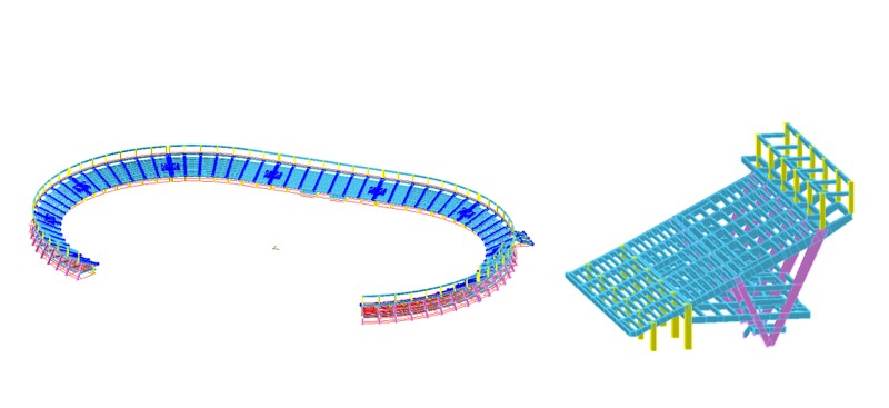 市建科院檢測團隊著重對體育場看臺、主席臺、球員通道、觀眾出入口等區域展開了實時檢測,重點排查了裂縫、露筋等潛在風險隱患。檢測團隊利用3D3S鋼結構分析軟件,建立三維計算模型,模擬賽事期間人員荷載、風雨荷載等工況,計算網架承載能力與整體穩定性,并聚焦看臺梁板、立柱等核心承重構件,結合現場檢測數據,運用PKPM結構設計軟件進行承載力復核。經過連續高強度作業,檢測團隊如期完成全部檢測與分析工作,并準時提交鑒定報告。