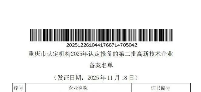 近日,全國高新技術企業認定管理工作領導小組辦公室正式發布《對重慶市認定機構2025年認定報備的第二批高新技術企業進行備案的公告》,重慶設計集團市建科院所屬子企業重慶市建設工程質量檢驗測試中心有限公司,獲評“國家高新技術企業”。